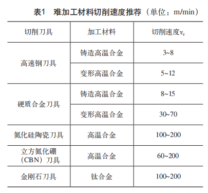切削參數(shù)同樣是影響加工效果的重要因素,對應(yīng)材料使用合適的切削參數(shù)加工能夠有效提高加工質(zhì)量與效率。以切削速度參數(shù)為例,切削速度低容易在材料表面形成積屑瘤區(qū),降低表面加工精度;切削速度高容易發(fā)生熱量積聚,引起工件和刀具的燒傷。對此,哈爾濱理工大學(xué)翟元盛教授團(tuán)隊(duì)分析常用難加工材料的機(jī)械物理性質(zhì),通過正交加工試驗(yàn)總結(jié)出難加工材料切削速度推薦表[14](見表1),使用表中推薦的刀具和切削速度進(jìn)行加工能夠有效減小加工缺陷與刀具磨損,提高加工質(zhì)量。