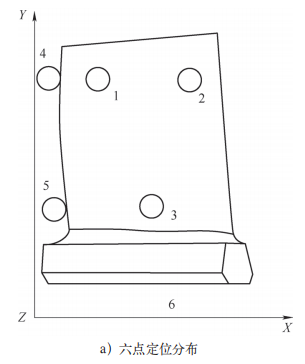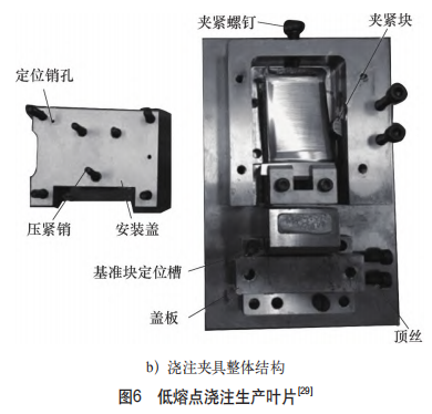航空發(fā)動機(jī)葉片傳統(tǒng)加工工藝中的工藝裝備是使用低熔點(diǎn)合金等相變材料進(jìn)行填充輔助支撐,即對工件毛坯進(jìn)行六點(diǎn)定位夾持后,將工件的定位基準(zhǔn)通過低熔點(diǎn)合金澆注成為一個(gè)澆注塊,對工件進(jìn)行輔助支撐,并且把復(fù)雜的點(diǎn)定位轉(zhuǎn)換成規(guī)則的面定位,進(jìn)而進(jìn)行待加工部位的精密加工(見圖6)。這種工藝方法存在明顯的缺陷:定位基準(zhǔn)轉(zhuǎn)換導(dǎo)致定位精度下降;生產(chǎn)準(zhǔn)備復(fù)雜、低熔點(diǎn)合金的澆注和融化也帶來了工件表面的殘留和清理問題,同時(shí)澆注和融化的工況也比較惡劣[30]。為了解決上述工藝缺陷,常用的方法是引入一種多點(diǎn)支撐結(jié)構(gòu)與相變材料相結(jié)合[31],支撐結(jié)構(gòu)上端與工件接觸進(jìn)行定位,下端浸入低熔點(diǎn)合金腔室中,基于低熔點(diǎn)合金的相變特性實(shí)現(xiàn)柔性輔助支撐。雖然引入支撐結(jié)構(gòu)能夠避免低熔點(diǎn)合金接觸葉片產(chǎn)生的表面缺陷,但是受到相變材料的性能限制,相變?nèi)嵝怨ぱb無法同時(shí)滿足高剛度和高響應(yīng)速度兩大需求,難以應(yīng)用于高效率自動化生產(chǎn)當(dāng)中。