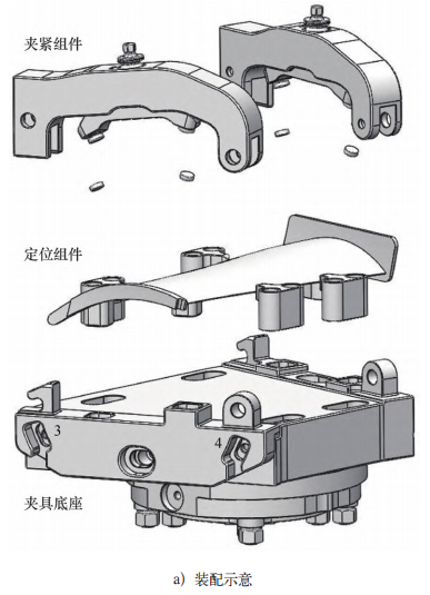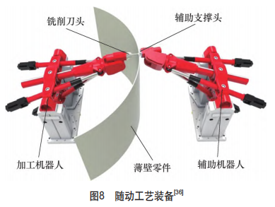 目前在工藝裝備設(shè)計(jì)過程中,普遍使用有限元分析、遺傳算法等手段來優(yōu)化多點(diǎn)輔助支撐的布局[35],但是優(yōu)化的結(jié)果通常只能保證在一點(diǎn)上的加工變形量達(dá)到最小,而并不能保證在其他加工部位也能起到同等的抑制變形效果。在葉片加工過程中,通常在同一機(jī)床上對工件進(jìn)行一系列的走刀加工,但加工不同部位的裝夾需求是不同的,甚至可能是時(shí)變的。對于靜態(tài)多點(diǎn)支撐方法,如果通過增加輔助支撐的數(shù)量來提高工藝系統(tǒng)剛度,一方面會增大工裝的質(zhì)量和體積,另一方面也壓縮了刀具的運(yùn)動空間。而如果在加工不同部位時(shí)重新設(shè)置輔助支撐的位置,則必然會中斷加工過程,降低加工效率。因此,根據(jù)加工過程自動在線調(diào)節(jié)支撐布局和支撐力的隨動工藝裝備[36-38]被提出。隨動工藝裝備(見圖8)能夠在任一加工工序開始前,基于時(shí)變切削過程的刀具軌跡與工況轉(zhuǎn)變,通過刀具與工裝的協(xié)同配合實(shí)現(xiàn)動態(tài)支撐:先將輔助支撐移動到有助于抑制當(dāng)前加工變形的位置,使工件的加工區(qū)域受到積極支撐,而工件其他部位在盡可能少的接觸下保持定位不變,從而匹配加工過程中時(shí)變的裝夾需求。