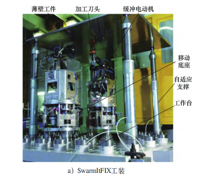 目前,國內(nèi)外學(xué)者均在自重構(gòu)群夾具方面進(jìn)行了一些研究與嘗試。國外方面,歐盟項(xiàng)目SwarmItFIX開發(fā)了一種新的高度適應(yīng)性自重構(gòu)夾具系統(tǒng)[41],該系統(tǒng)使用一組移動輔助支撐在工作臺上自由移動并實(shí)時(shí)重新定位,以更好地支撐加工零件。SwarmItFIX系統(tǒng)的原型已在該項(xiàng)目中實(shí)現(xiàn)(見圖9a),并在一家意大利飛機(jī)制造商的場地上進(jìn)行了測試。國內(nèi)則是有清華大學(xué)王輝團(tuán)隊(duì)制作了一種可與機(jī)床協(xié)同控制的四點(diǎn)裝夾支撐工作臺[42](見圖9b),可以在渦輪葉片榫根的精加工過程中對處于懸臂狀態(tài)的榫根進(jìn)行支撐以及自動刀具避讓。在加工過程中,四點(diǎn)輔助支撐與數(shù)控加工中心協(xié)同配合,根據(jù)刀具運(yùn)動位置重構(gòu)四點(diǎn)接觸狀態(tài),既避免了刀具與輔助支撐相互干涉,又保證了支撐效果。