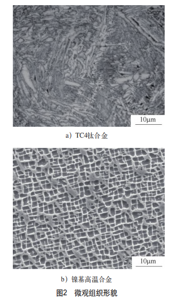 為了滿足在高溫高壓環(huán)境下的穩(wěn)定服役要求,航空發(fā)動機葉片常用材料為鈦合金或高溫合金,近年來,鈦鋁金屬間化合物也成為一種極有應用潛力的葉片材料。鈦合金具有導熱性低、塑性低、彈性模量低以及親合力強等特點,使其切削過程中出現(xiàn)切削力大、切削溫度高、加工硬化嚴重和刀具磨損大等問題,是典型的難加工材料(微觀組織形貌見圖2a)[7]。高溫合金的主要特點是塑性及強度高,導熱性差,并且內(nèi)部含有大量致密的固溶體[8]。在切削過程中塑性變形使得晶格嚴重扭曲,變形抗力大,導致切削力大并伴隨嚴重的冷硬現(xiàn)象,也是典型的難加工材料(微觀組織形貌見圖2b)。因此,研發(fā)鈦合金與高溫合金等難加工材料的高效精密切削技術至關重要。為了實現(xiàn)難加工材料的高效精密加工,國內(nèi)外學者從創(chuàng)新切削加工方法、優(yōu)選加工刀具材料以及優(yōu)化切削參數(shù)等方向進行深入研究。