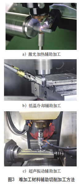 低溫冷卻輔助加工[10](見圖3b)則是使用液氮、高壓二氧化碳氣體等冷卻介質(zhì)噴涂到切削部位,對切削加工過程進行冷卻,避免因為材料導熱性能差引起的局部切削溫度過高問題,還使得工件局部冷脆,增強斷屑效果。英國的Nuclear AMRC公司成功使用高壓二氧化碳氣體對鈦合金的加工過程進行冷卻,與干切削狀態(tài)對比分析表明,低溫冷卻輔助加工不僅能夠降低切削力,提高切削加工表面的質(zhì)量,還能有效減小刀具磨損,增長刀具的使用壽命。此外,超聲振動輔助加工[11,12](見圖3c)也是難加工材料高效切削加工的有效方法。通過在刀具上施加高頻、微小幅度的振動,實現(xiàn)加工過程中刀具與工件之間發(fā)生間斷性分離,改變了材料去除機理,增強了動態(tài)切削的穩(wěn)定性,有效避免刀具與已加工表面間的摩擦,降低切削溫度和切削力,降低表面粗糙度值,減小刀具磨損,其優(yōu)良的工藝效果已經(jīng)得到廣泛的關注。