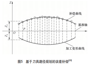 基于上述的預測模型或在機測量技術,人們能夠?qū)庸?shù)進行優(yōu)化甚至是實時調(diào)控。主流的方向是通過刀具路徑的重新規(guī)劃來對變形和振動造成的誤差進行補償。這一方向常用的方法是“鏡像補償法”[20](見圖5),該方法通過對名義刀具軌跡進行修正,補償單次切削的變形量。但是單次補償會產(chǎn)生新的加工變形,因此需要通過多次補償在切削力和加工變形之間建立迭代關系,逐次修正變形量。除了基于刀具路徑規(guī)劃進行主動誤差補償?shù)姆椒ㄖ猓S多學者也在研究通過優(yōu)化調(diào)控切削參數(shù)、刀具參數(shù)等方式來控制變形和振動。對于某型號航空發(fā)動機葉片的切削加工,改變加工參數(shù)進行多輪正交試驗,基于試驗數(shù)據(jù)分析各切削參數(shù)、刀具參數(shù)對葉片加工變形、振動響應的影響規(guī)律[21-23],建立經(jīng)驗預測模型,從而優(yōu)選加工參數(shù),有效減小