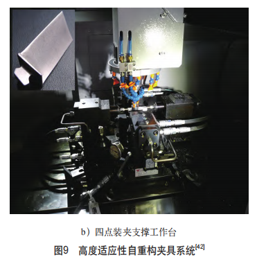 目前,國內(nèi)外學者均在自重構群夾具方面進行了一些研究與嘗試。國外方面,歐盟項目SwarmItFIX開發(fā)了一種新的高度適應性自重構夾具系統(tǒng)[41],該系統(tǒng)使用一組移動輔助支撐在工作臺上自由移動并實時重新定位,以更好地支撐加工零件。SwarmItFIX系統(tǒng)的原型已在該項目中實現(xiàn)(見圖9a),并在一家意大利飛機制造商的場地上進行了測試。國內(nèi)則是有清華大學王輝團隊制作了一種可與機床協(xié)同控制的四點裝夾支撐工作臺[42](見圖9b),可以在渦輪葉片榫根的精加工過程中對處于懸臂狀態(tài)的榫根進行支撐以及自動刀具避讓。在加工過程中,四點輔助支撐與數(shù)控加工中心協(xié)同配合,根據(jù)刀具運動位置重構四點接觸狀態(tài),既避免了刀具與輔助支撐相互干涉,又保證了支撐效果。