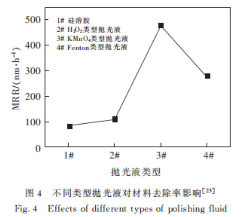 在目前的報(bào)道中,對于拋光液的研究思路包括改變氧化劑的種類和濃度、溶液pH值、分散劑、磨料等方法。通過調(diào)節(jié)拋光液中不同成分的含量,控制機(jī)械磨損與化學(xué)反應(yīng)之間的平衡,對獲得高M(jìn)RR和無原子平面缺陷的表面起著關(guān)鍵作用。