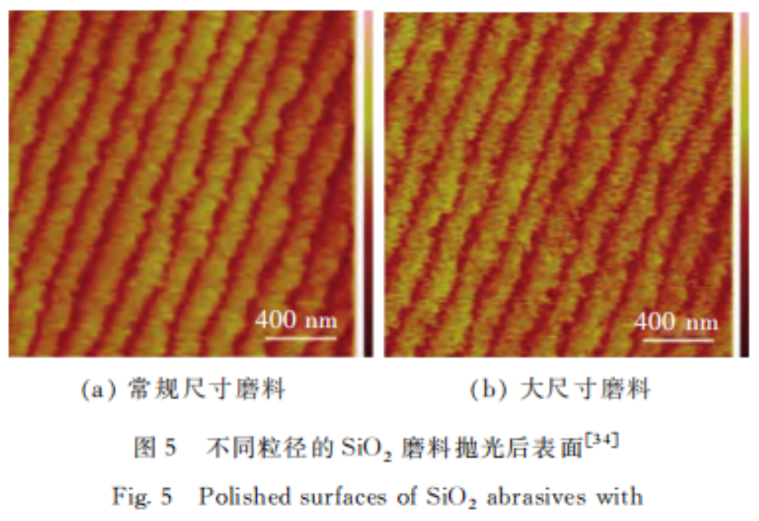 此外,也研究了不同粒徑的同種磨料對機(jī)械作用的影響。2014年,X.L.Shi等人詳細(xì)分析了不同磨料粒徑的硅溶膠對4H-SiC晶圓拋光性能的影響。通過理論推導(dǎo)和實(shí)驗(yàn)分析得出,當(dāng)磨料粒徑較大時(shí)會導(dǎo)致不規(guī)則的平臺邊緣。反之,如果磨料粒徑較小,材料的去除將更規(guī)則,并且平臺邊緣將更平坦和光滑,指出磨料粒徑是決定CMP效率和晶圓表面最終平坦化質(zhì)量的重要因素。圖5所示為不同粒徑SiO2磨料拋光后的表面,其中常規(guī)尺寸磨料平均粒徑30.8nm,大尺寸磨料平均粒徑79.3nm。