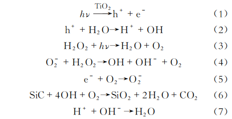 光催化化學(xué)機(jī)械拋光(PCMP)示意圖如圖7所示。將單晶SiC工件粘貼在拋光頭底端,使用含有光催化劑的拋光液,通過紫外光的照射,光催化劑顆粒表面產(chǎn)生空穴和電子,吸附在光催化劑顆粒表面的H2O和OH-可通過光生電子和空穴氧化成羥基自由基,然后將單晶SiC表面氧化成SiO2,化學(xué)反應(yīng)式為