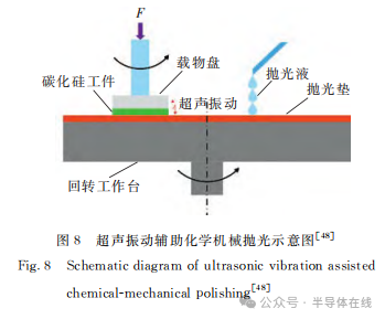 超聲振動輔助化學(xué)機(jī)械拋光(UVACMP)是一種經(jīng)濟(jì)有效地提高SiC單晶拋光性能的技術(shù)。通過超聲波發(fā)生器將電信號轉(zhuǎn)換成超聲振動,超聲振動作用在拋光區(qū),使拋光液中磨料更加分散,并且使磨料獲得一定動能,加大了拋光中的機(jī)械作用,同時(shí)振動過程中產(chǎn)生的熱促進(jìn)了拋光中的化學(xué)作用,超聲振動輔助化學(xué)機(jī)械拋光示意圖如圖8所示。
