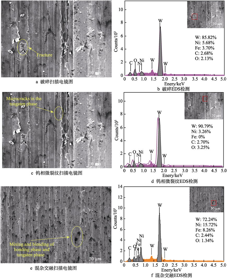 4)磨削后鎢合金表面出現(xiàn)了單顆??虅潉澓凵系乃腥コ卣?,與單顆粒劃痕去除特征吻合。不同的是,磨削后的劃痕底部出現(xiàn)了區(qū)域性和放射狀裂紋,并通過截面顯微法和 EDS 檢測技術(shù)探究了裂紋的成因及擴(kuò)展情況。