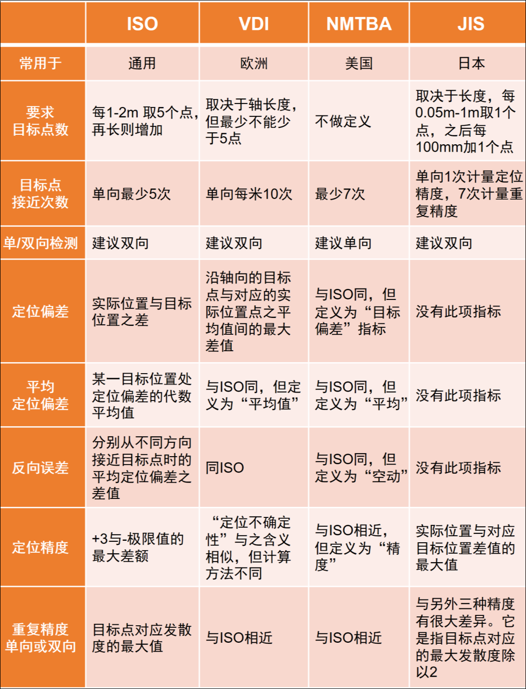 這是4種標(biāo)準(zhǔn)的關(guān)鍵區(qū)別點(diǎn)描述,正如人們所期待的,總有一天,所有機(jī)床生產(chǎn)商都統(tǒng)一遵循ISO標(biāo)準(zhǔn)。因此,這里選擇ISO標(biāo)準(zhǔn)作為基準(zhǔn)。下表中對(duì)4種標(biāo)準(zhǔn)進(jìn)行了比較,本文僅涉及線性精度,因?yàn)樾D(zhuǎn)精度的計(jì)算原理與之基本一致。