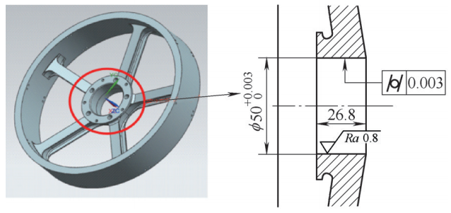 動量輪利用陀螺定軸性和轉(zhuǎn)速變化而產(chǎn)生的反作用力矩,來穩(wěn)定或改變衛(wèi)星的姿態(tài)。動量輪產(chǎn)品的加工精度直接影響整個航天器的運行壽命、控制精度和可靠性,而輪體內(nèi)孔的加工質(zhì)量則決定了動量輪的整體裝配精度。該部位的形狀及尺寸精度要求極為嚴(yán)格,在實際生產(chǎn)中,由于內(nèi)孔采用常規(guī)車削和磨削無法保證尺寸和形狀公差,因此輪體內(nèi)孔精密加工成為動量輪制造瓶頸。